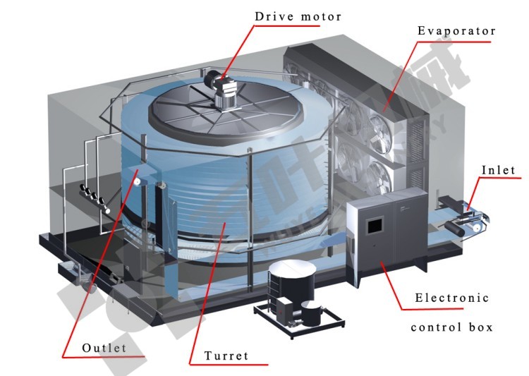 Employs a fully automated continuous spiral freezing design. Soup dumplings move at a constant speed on a food-grade stainless steel mesh belt, spiraling upward or downward, making full use of vertical space to achieve the perfect balance of small footprint and large freezing capacity. Equipped with a variable frequency speed control system for stepless adjustment of conveyor speed according to product specifications and process requirements. Freezing capacity ranges from 500kg/h to 10,000kg/h, with custom design and manufacturing available based on client requirements.